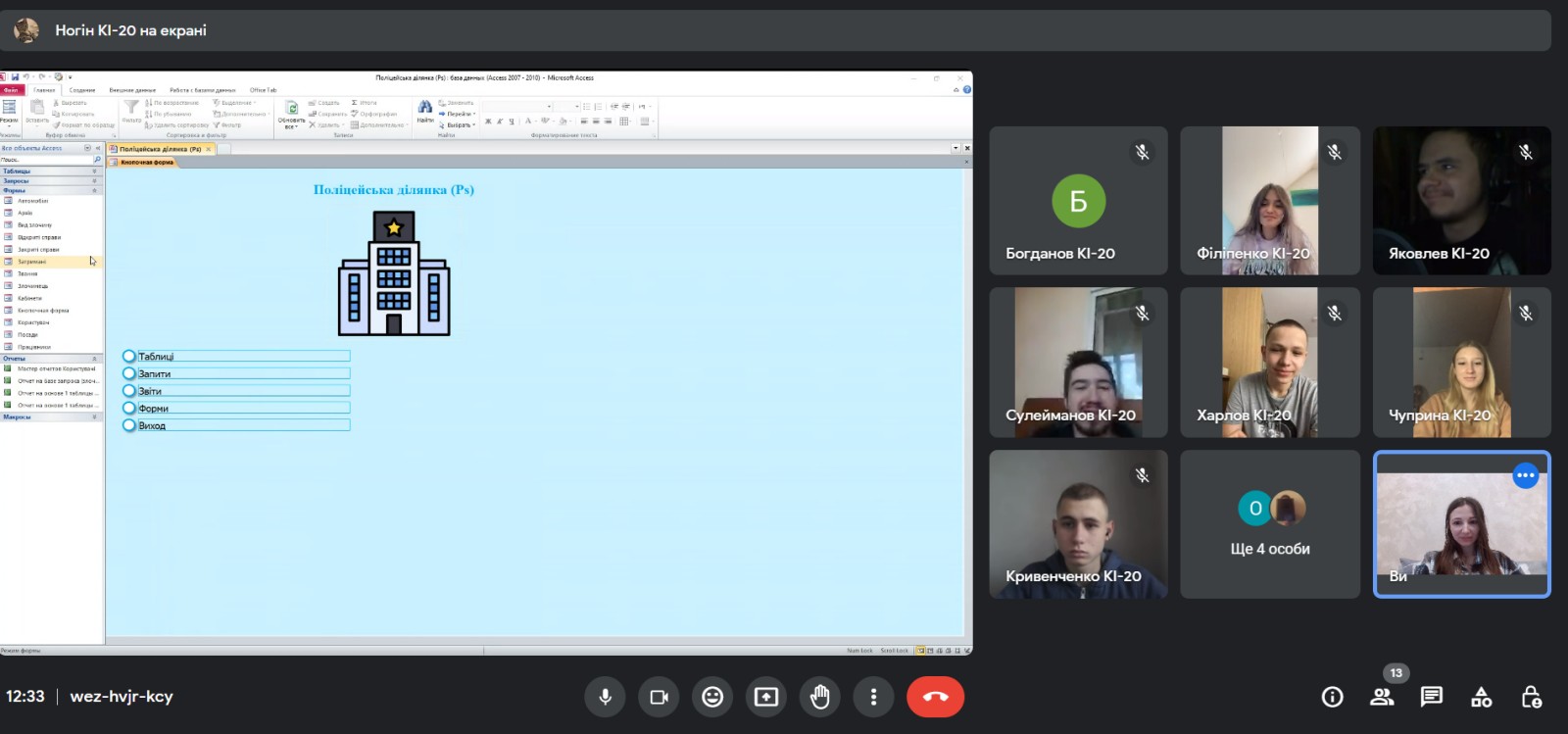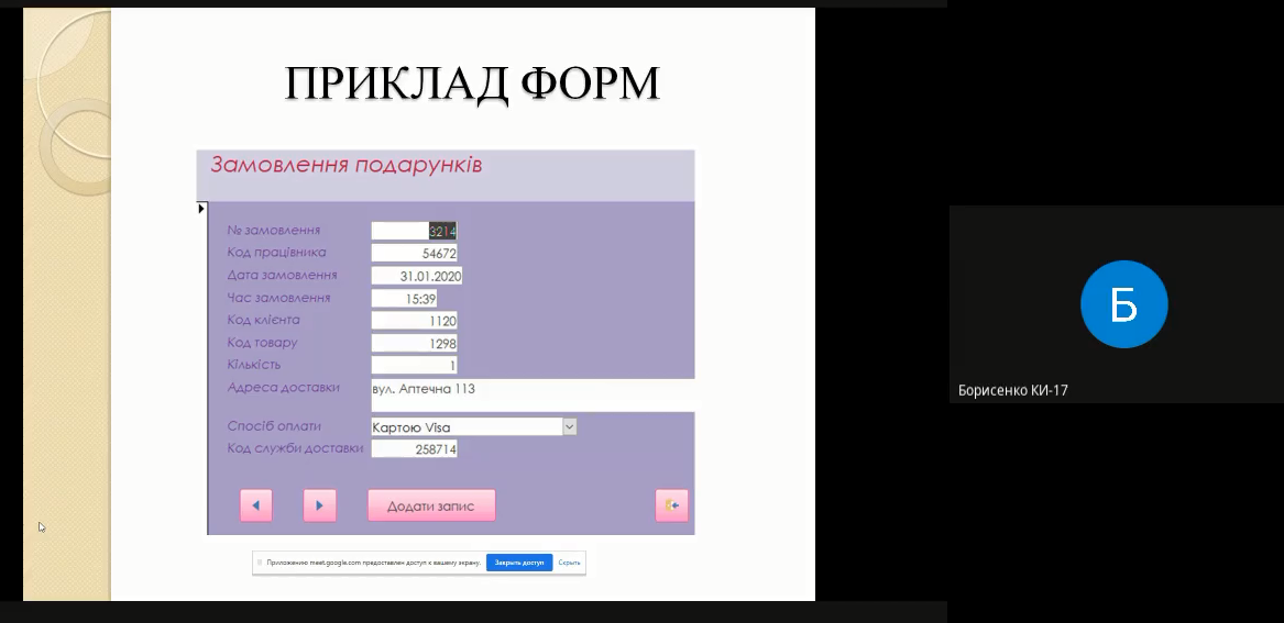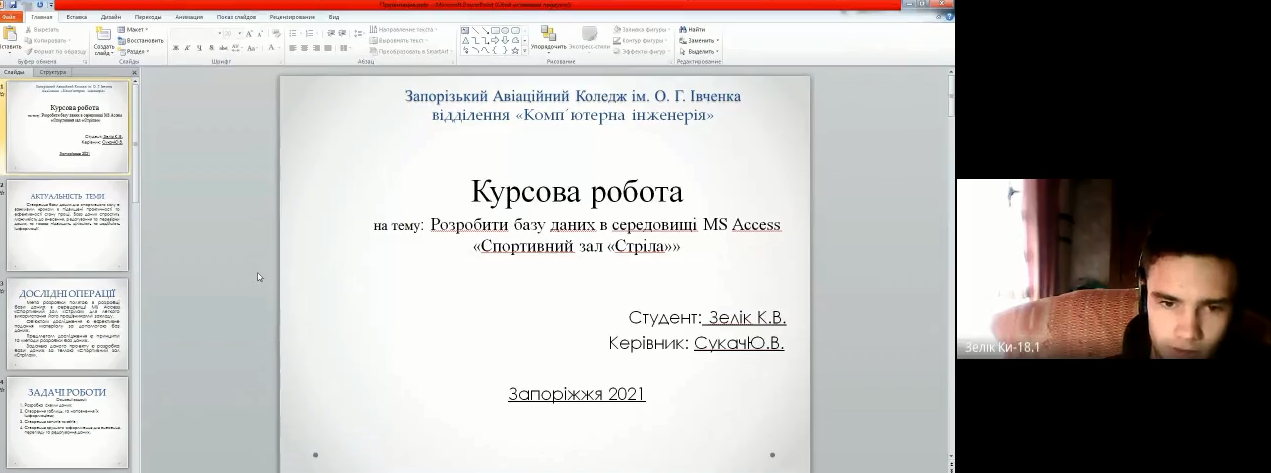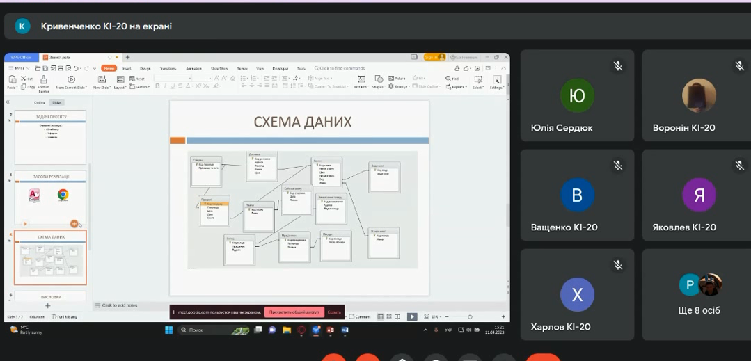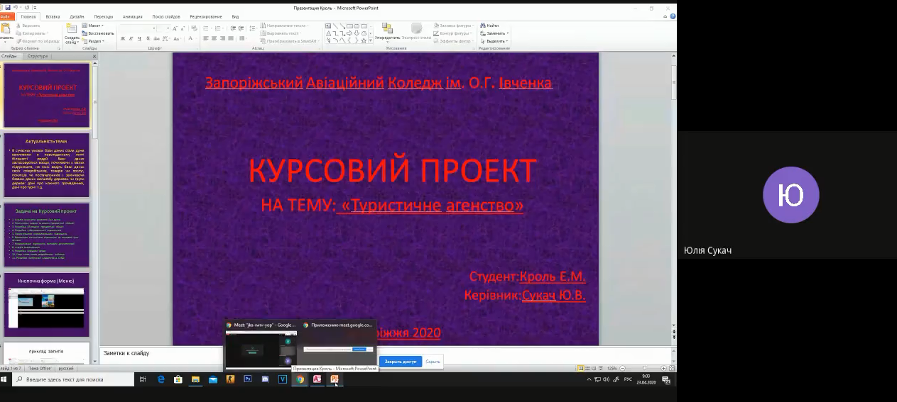 Традиційним вже є онлайн-захист курсових проєктів за допомогою Google Meet. В цьому році в квітні. Відбувся захист курсових проєктів з дисципліни «Організація баз даних» серед студентів третього курсу спеціальності 123 «Комп’ютерна інженерія»