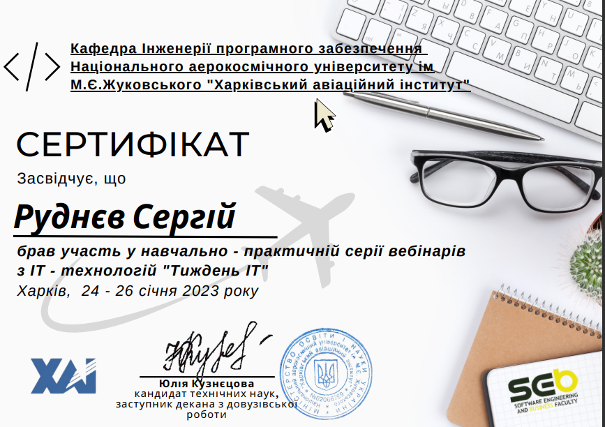 Програма тижня завжди дуже насичена і цікава: це і професійні майстер -класи провідних викладачів кафедри, цікаві доповіді представників ІТ компаній, вікторина з призами та інше. Руднєв Сергій (КІ 22-1) отримав сертифікат учасника. Вітаємо. Так тримати!