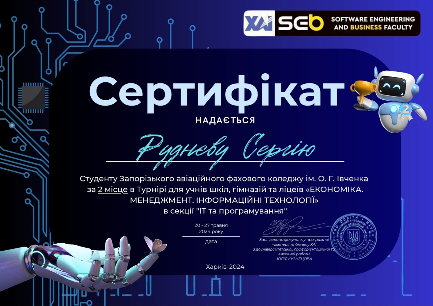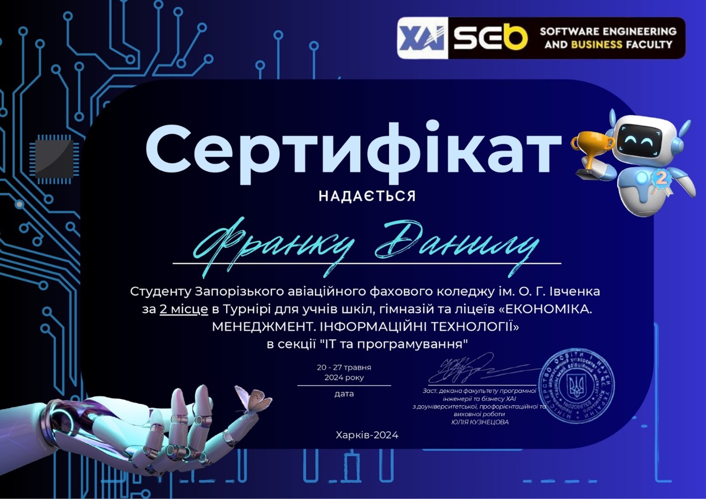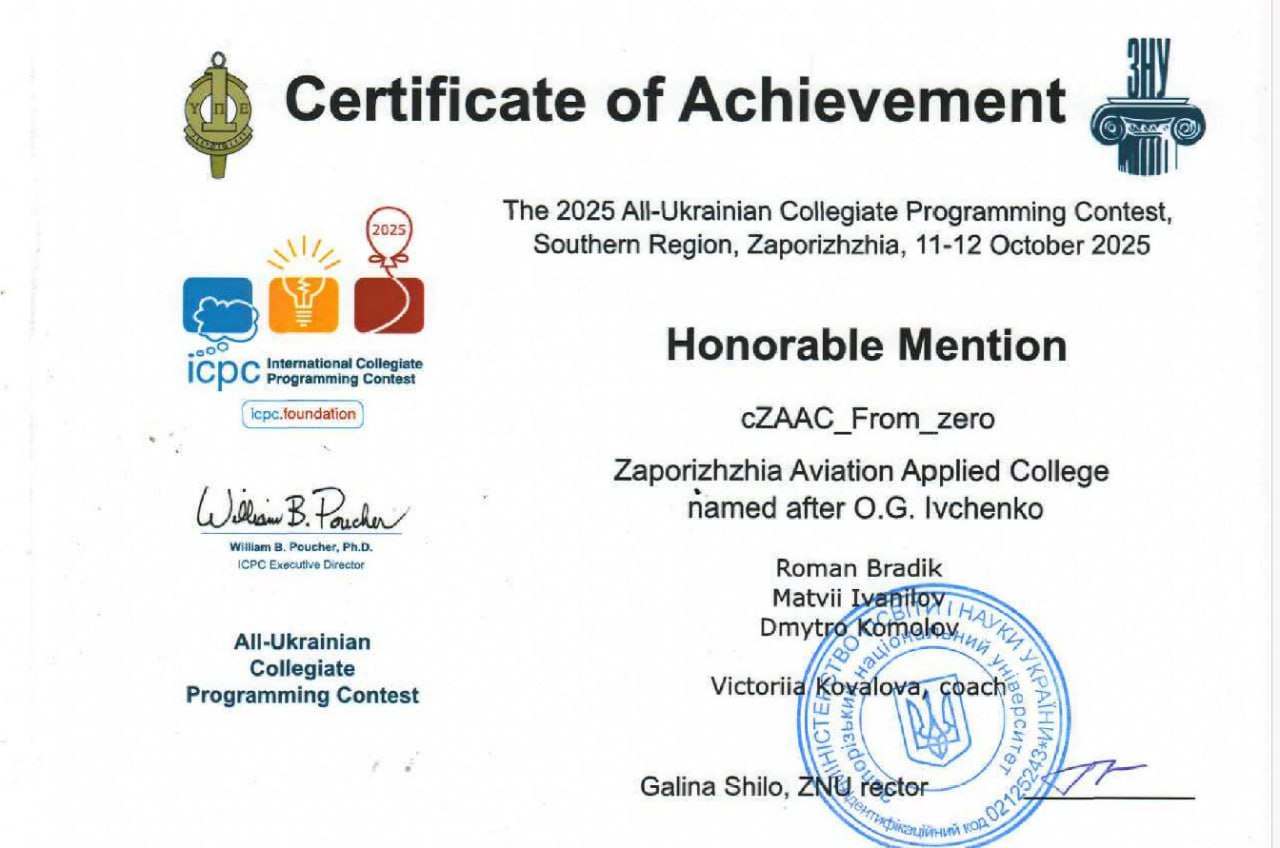 Студенти Запорізького авіаційного фахового коледжу, Руднєв Сергій(група КІ-22-1) та Франк Данило(група КН-22), успішно взяли участь у турнірі "ЕКОНОМІКА. МЕНЕДЖМЕНТ. ІНФОРМАЦІЙНІ ТЕХНОЛОГІЇ", який проводився на базі Харківського авіаційного інституту (ХАІ).