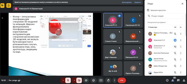 | 5 | Алєксєєв Артем | КI 21 | Кичак Артем Андрійович та Кухар Микола Миколайович | Інтерактивна платформа для створення 3D-моделей та анімацій |