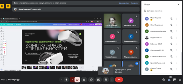 | 6 | Замкова Даря | КI 23 | Мітін Вадим Павлович | Перспективи розвитку VR/AR технологій у освіті комп'ютерних спеціальностей |