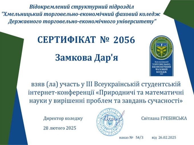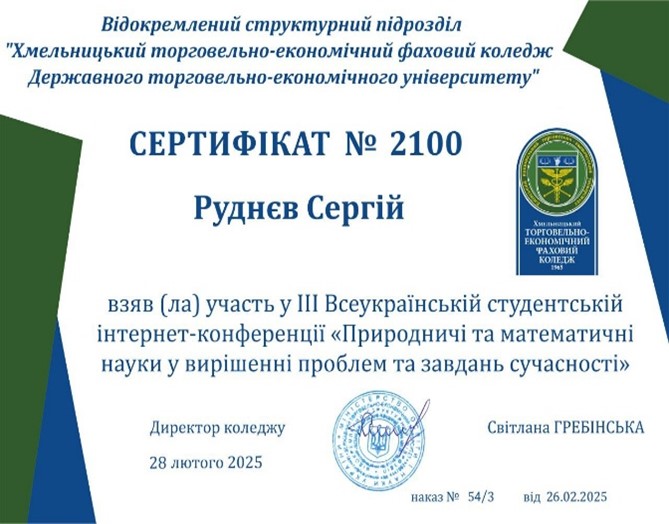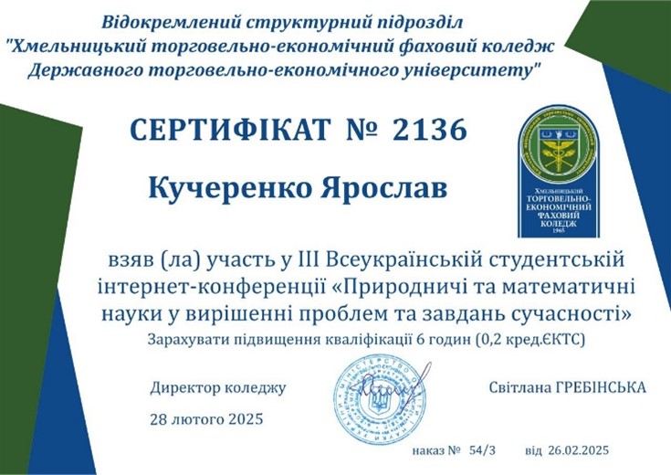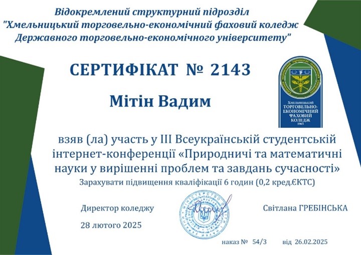 28 лютого 2025 року у Хмельницькому торговельно-економічному фаховому коледжі Державного торговельно-економічного університету відбулася ІІІ Всеукраїнська студентська науково-практична інтернет-конференція «ПРИРОДНИЧІ ТА МАТЕМАТИЧНІ НАУКИ У ВИРІШЕННІ ПРОБЛЕМ ТА ЗАВДАНЬ СУЧАСНОСТІ». У конференції взяли участь студенти з різних куточків України, які представили свої дослідження у галузі Природничих наук та охорони довкілля, Комп’ютерної та програмної інженерії, сучасних інформаційних технологій та інших.