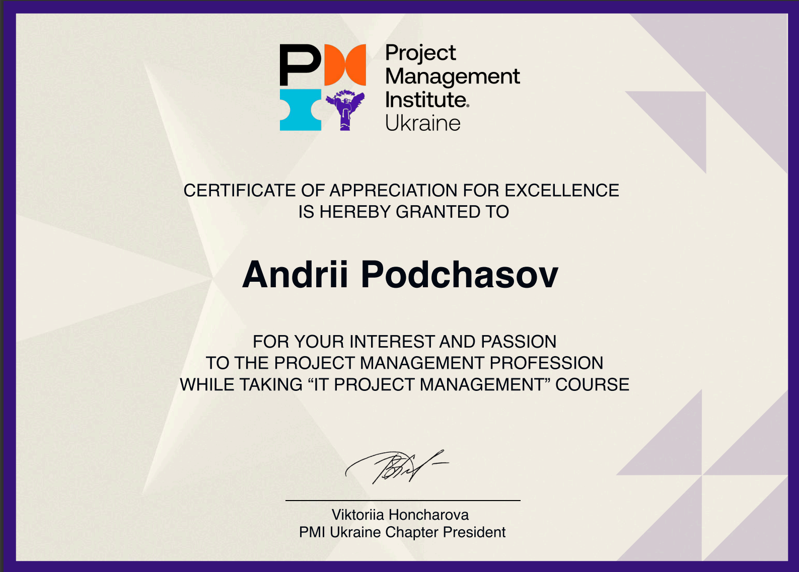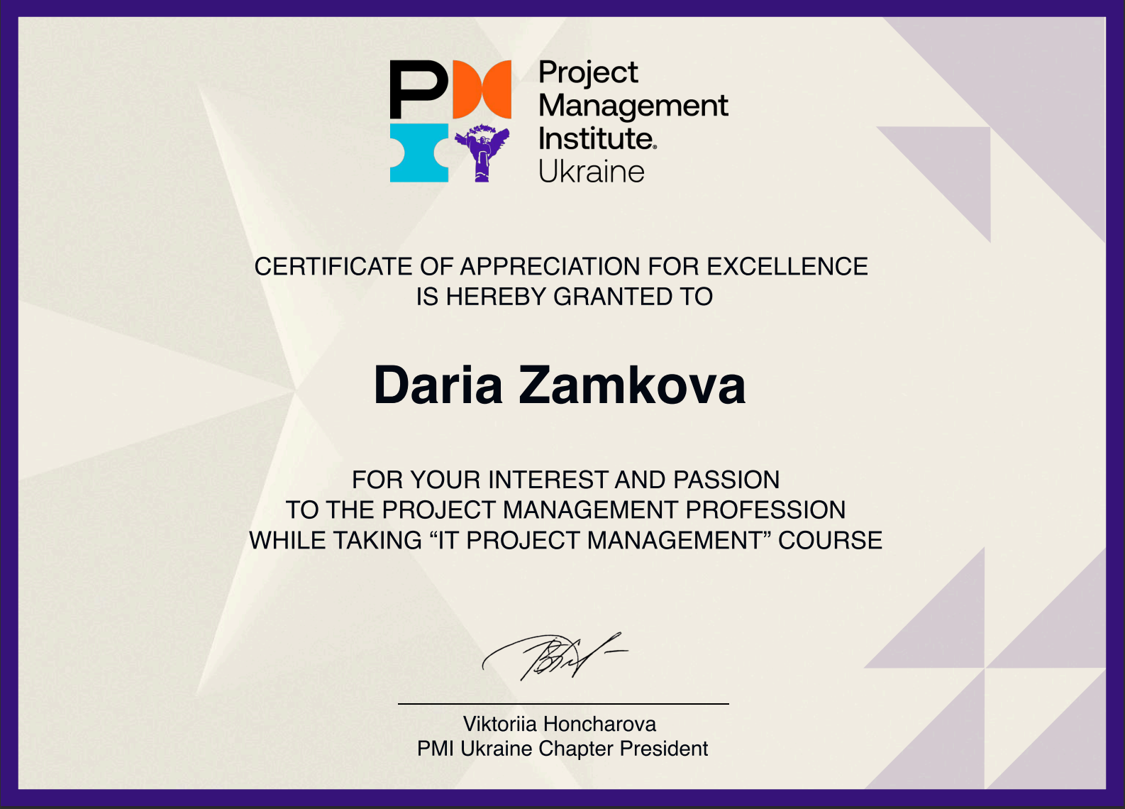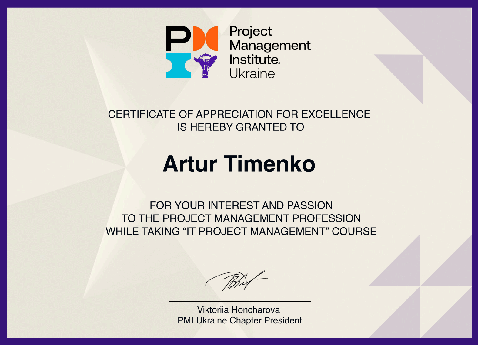 Викладач Тіменко Артур Валентинович разом зі студентами Запорізького авіаційного фахового коледжу ім. О. Г. Івченка — Замковою Дар’єю (група КІ-23) та Подчасовим Андрієм (група КІ-21) — успішно пройшли курс “IT Project Management” (Управління ІТ-проєктами), розроблений Інститутом управління проєктами (Project Management Institute, PMI).