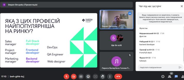 Так викладачі розповіли про ці спеціальності, про їх можливості та перспективи, за допомогою ресурсу QUIZZES проведено онлайн тестування першокурсників з комп’ютерних технологій, а студенти третього курсу представили свої курсові проєкти.