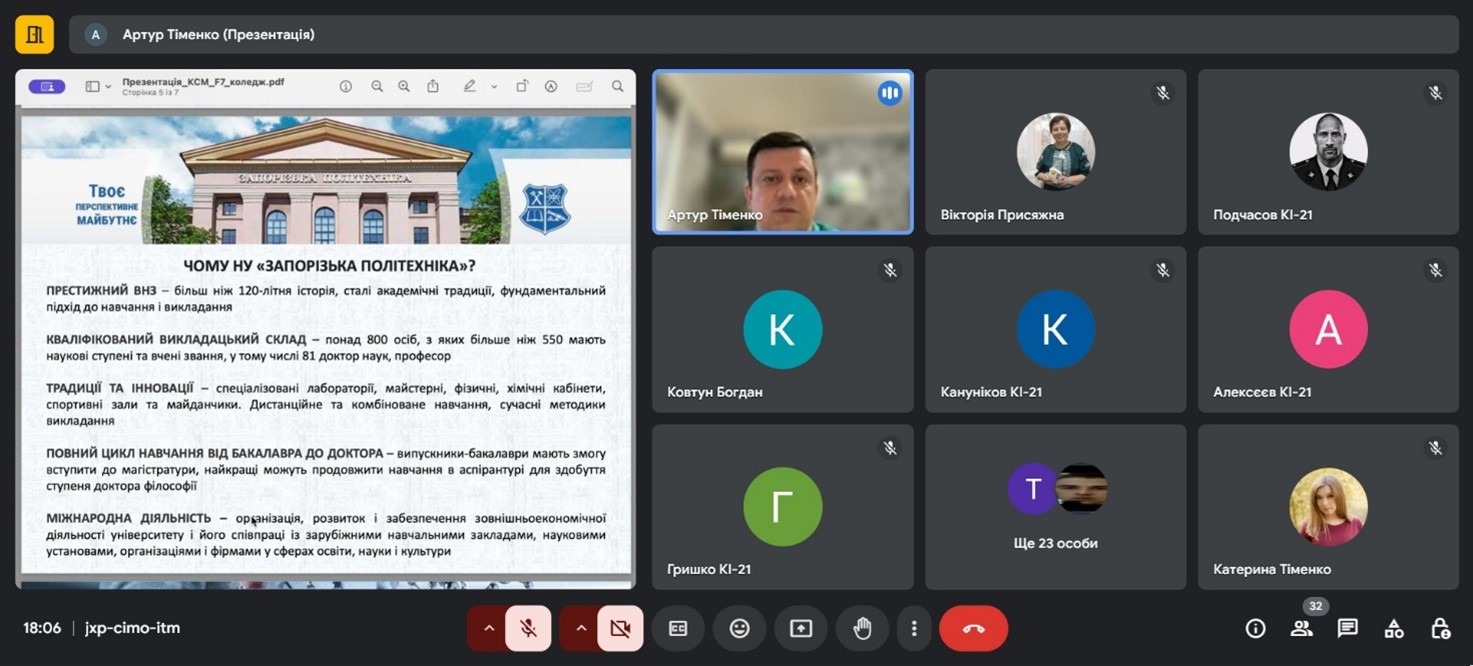 31 березня 2025 року відбулась онлайн зустріч випускної групи спеціальності 123 КІ 21 з представниками національного університету «Запорізька політехніка», а саме: старший викладач кафедри комп’ютерних систем та мереж Тіменко Артур Валентинович. Студентам була донесена інформація щодо: